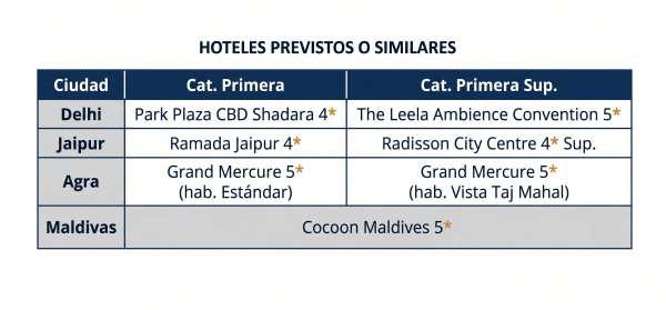 • Días 07: Delhi – Maldivas Desayuno. A la hora prevista, traslado al aeropuerto para tomar el vuelo con destino Male (no incluido). Llegada y traslado al hotel. Régimen de todo incluido. Alojamiento.