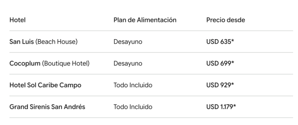 (*) Las tarifas «desde» aplican para la vigencia indicada y están dadas por persona en Dólares Americanos en acomodación doble.